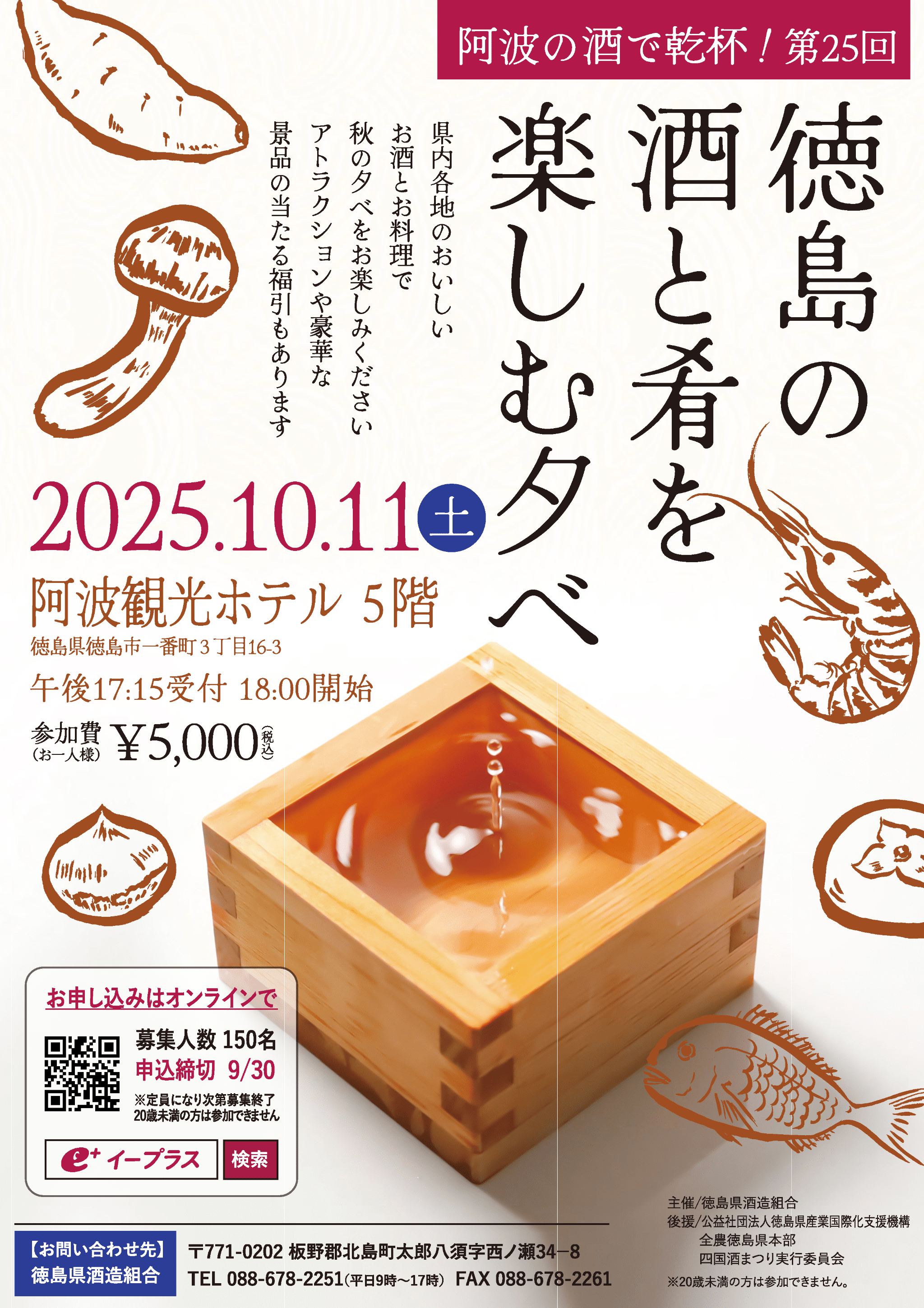 ----------------------------------------------------------- イベント概要 ・名称:阿波の酒で乾杯!2025 第25回 徳島の酒と肴を楽しむ夕べ ・日時:2025.10.11(土)17:15受付 18:00開始 ・場所:阿波観光ホテル 5階 ・参加申込:お申し込みはe+(イープラス)にて(募集人数:150名) ・参加申し込み締切:2025.9.30 ・参加費:お一人様 ¥5,000(税込)※20歳未満の方は参加できません ・主催:徳島県酒造組合 ・後援:公益社団法人徳島県産業国際化支援機構 全農徳島県本部 四国酒まつり実行委員会 ・お問い合わせ先:徳島県酒造組合 〒771-0202 板野郡北島町太郎八須字西ノ瀬34−8 電話 088-678-2251(平日9時〜17時) FAX 088-678-2261 ------------------------------------------------------------- 詳しくは、添付のチラシを参照ください。
